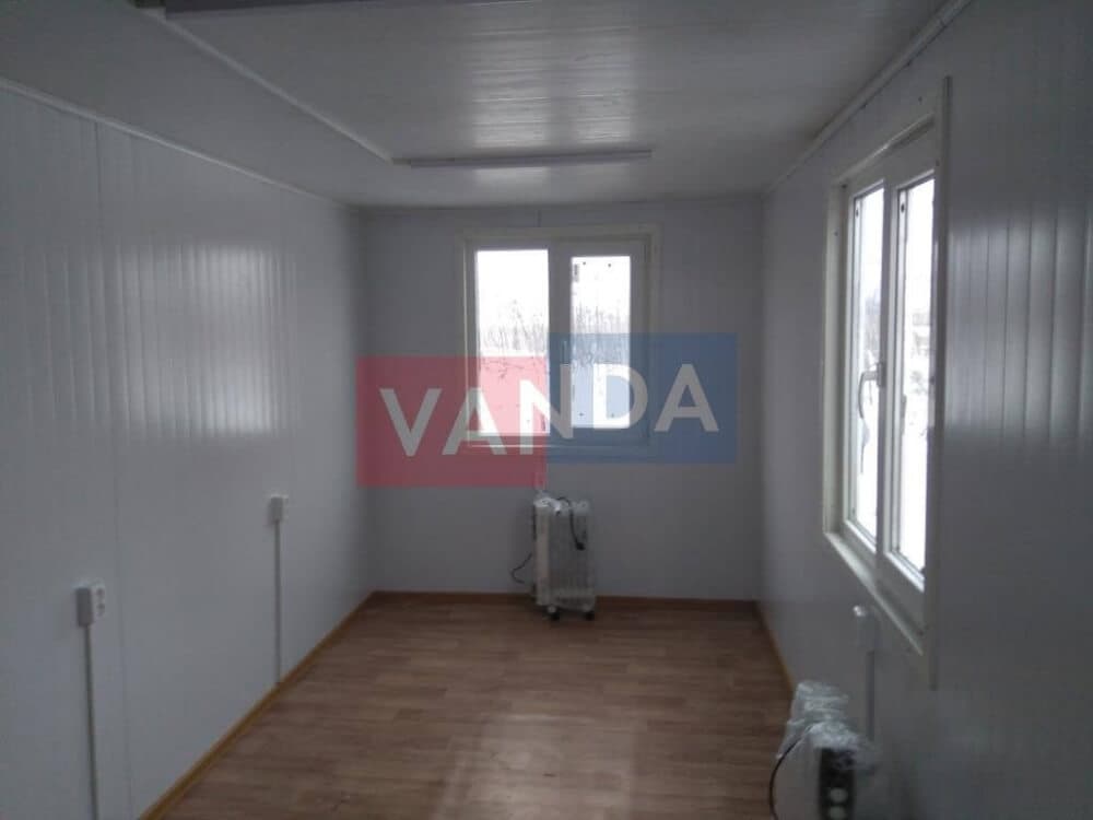 Данный контейнер не требует обустройства тяжеловесного фундамента, поскольку постройка легкая и устойчивая. Данный блок-контейнер может быть выполнен абсолютно любого размера и формы по эскизу заказчика.Контейнер состоит из металлического сварного основания. Стены изготовлены из сэндвич-панелей с прокладкой утеплителя. Крыша покрыта крашенным холоднокатаным металлом 1,2 мм. Помещение обустроено пароизоляцией при помощи технической пленки, которая проложена на полу и потолке. Внутренняя облицовка потолка выполнена из ПВХ-панелей, пол – из шпунтованной доски. Вход в помещение оборудован запирающейся металлической дверью.
